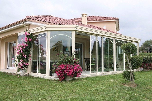 Прекрасным вариантом станет применение раздвижного остекления, чтобы открывать окна и чувствовать единение с природой. Подойдет вариант легких и прочных алюминиевых конструкций. Окна и двери могут быть сдвижными или распашными. Интерьер стеклянной веранды в частном доме может быть оформлен в любом стиле, однако акцент лучше сделать на большом количестве растений, чтобы обычное пространство превратилось в настоящий райский сад.