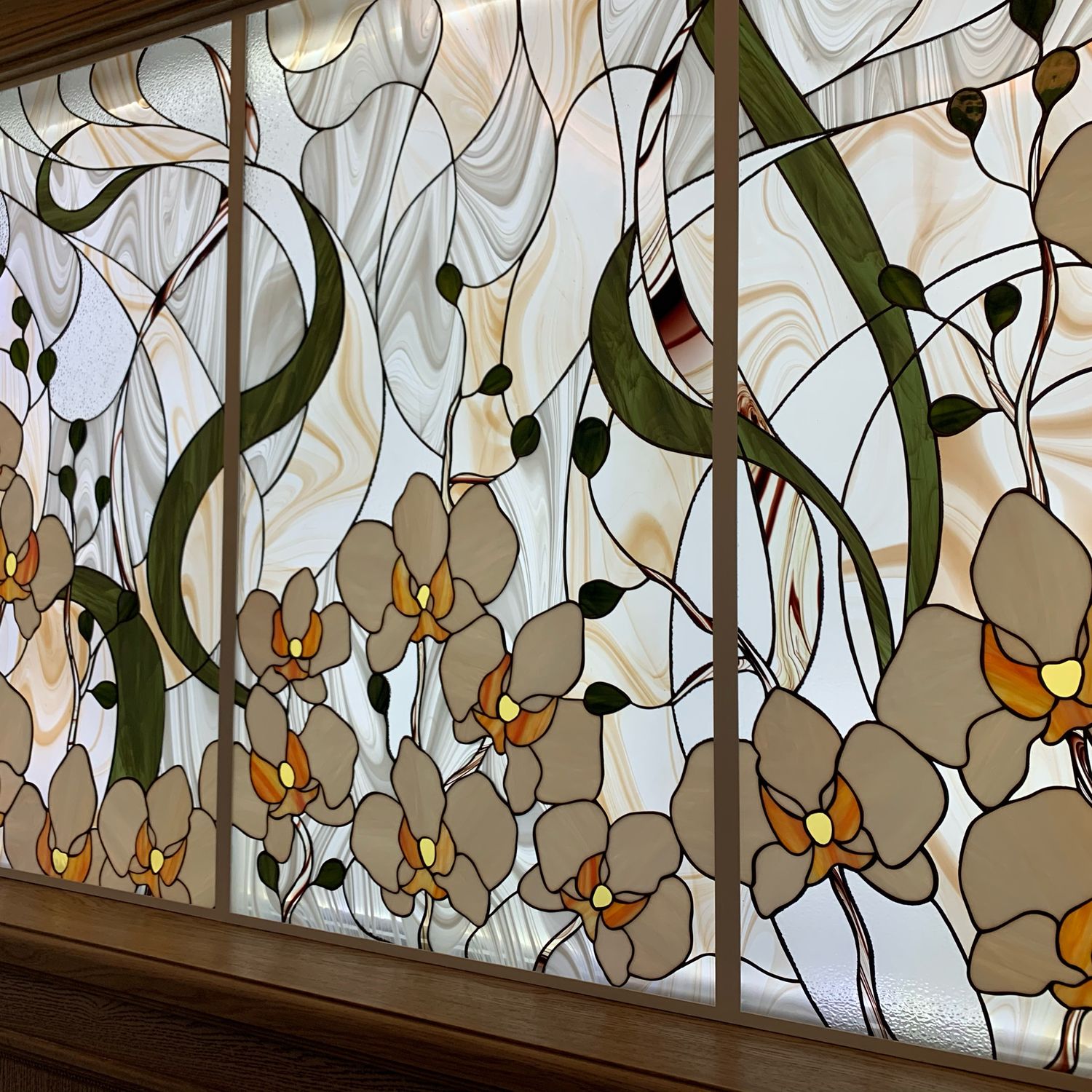 - витраж в панорамном окне, которое установлено от пола до потолка;