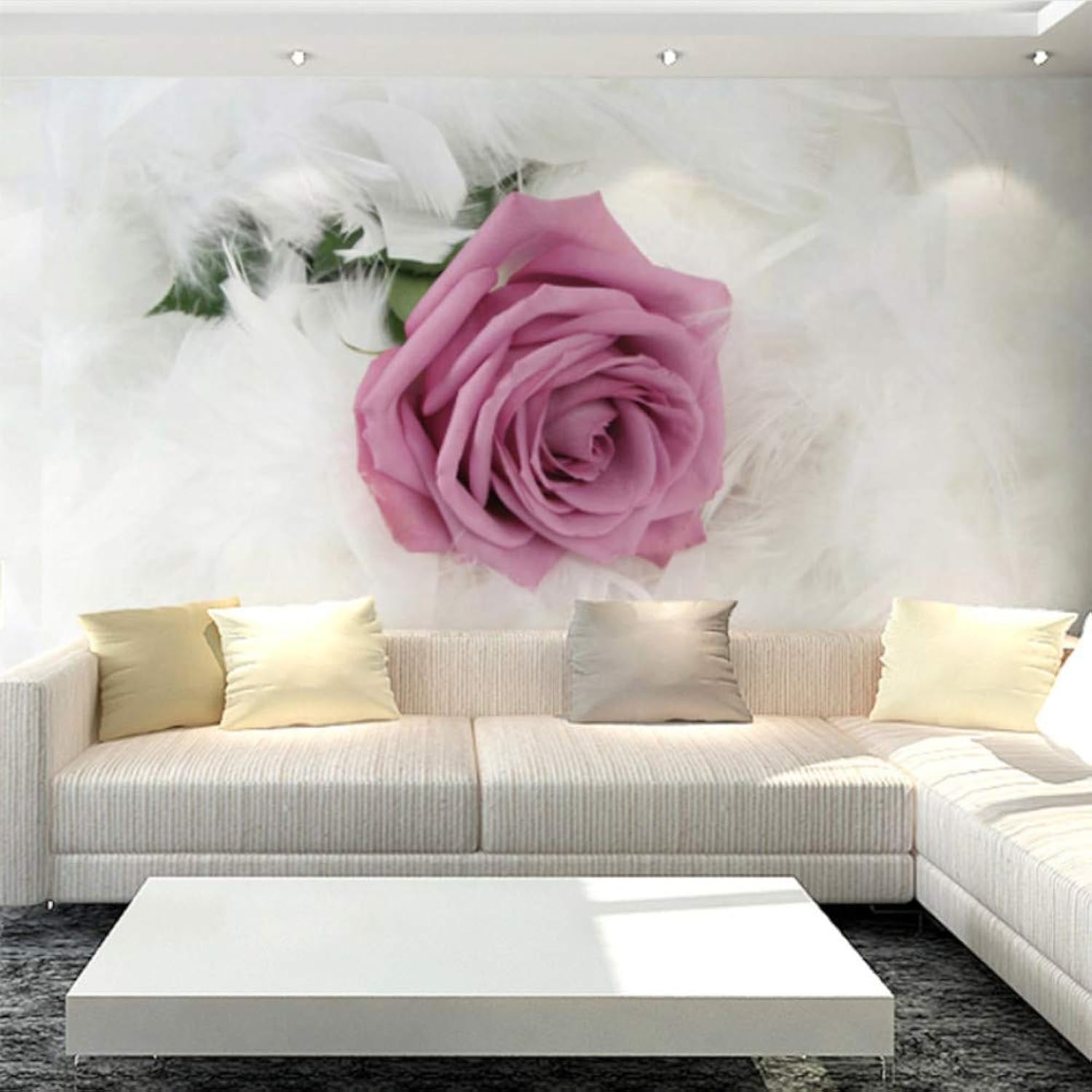 Рулонные варианты или фотообои с белыми розочками подходят практически для любого помещения. В спальню сюжеты из белых роз привнесут нотку нежности и лёгкости.