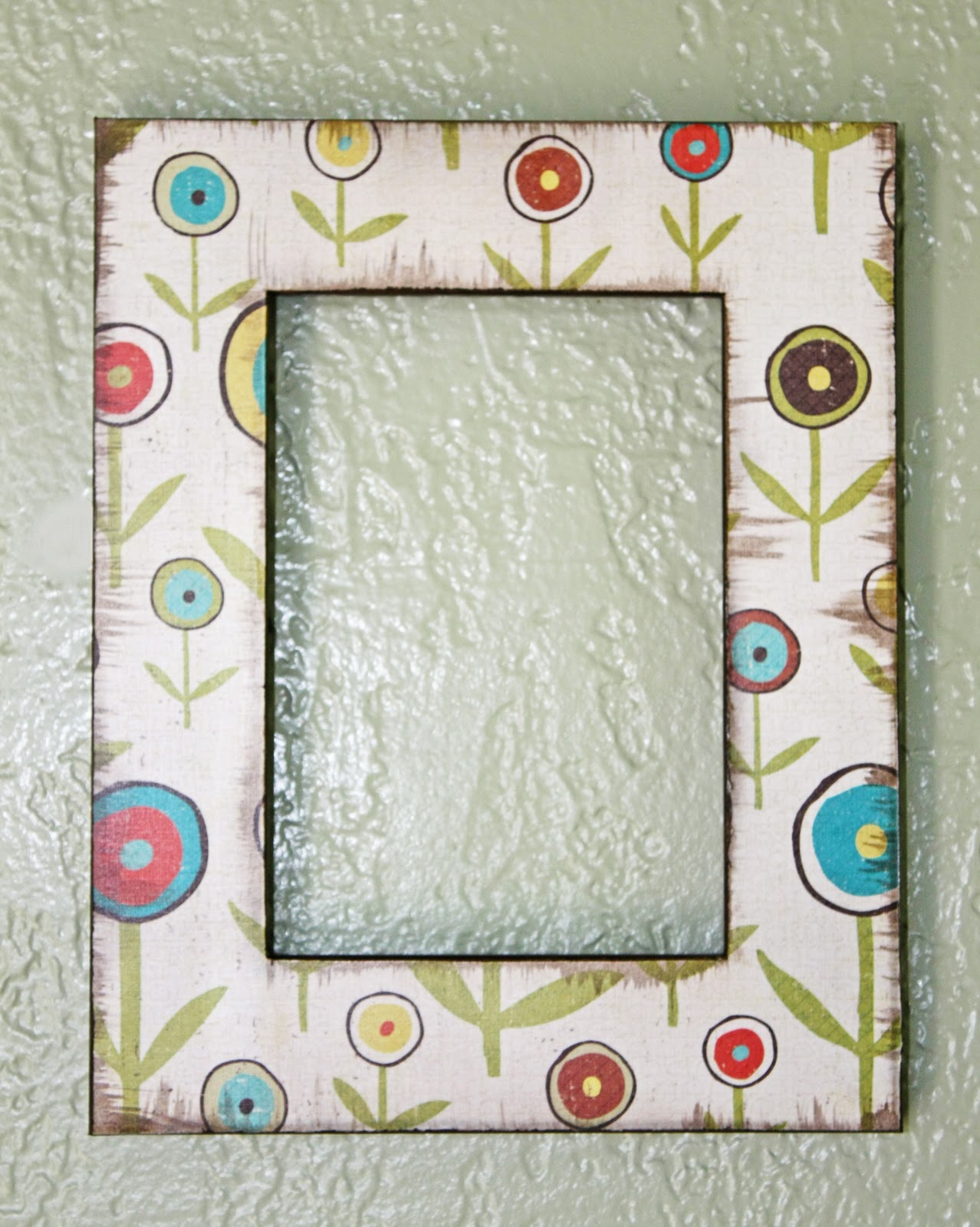 Приклеиваем бумагу с принтомПриклеиваем бумагу с принтом по краям. Два слоя бумаги дадут рамке дополнительный объем.