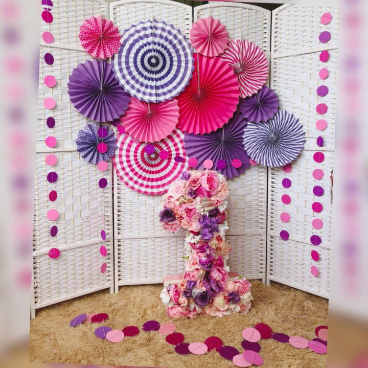 Для создания цветов используйте основную палитру тонов вашего праздника, экспериментируйте с размерами бутонов. Я уверена, что малышке, вам и гостям понравятся такие легкие цветочки, с которыми можно будет играть и после праздника или же использовать их в интерьере.