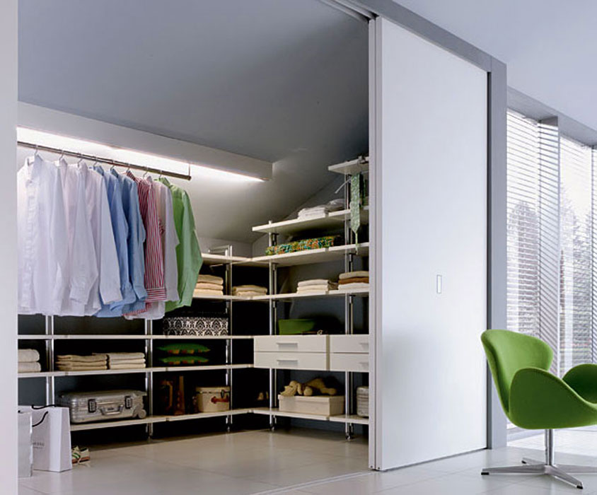 На мансарде обычно используют гардеробную открытого типа, либо делают раздвижные или створчатые двери — в зависимости от площади помещения.
