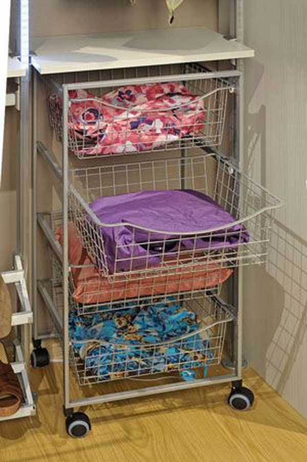 В совсем ограниченном пространстве следует монтировать небольшие открытые и неглубокие стеллажи и добавить в проект несколько выдвижных ящиков закрытого типа. Нижнее белье, конечно, можно сложить и в корзину, но присутствие закрытых ящиков оправдывается еще и с эстетической стороны, так как придаст конструкции завершенный вид, делая ее образом элегантности и стильности.