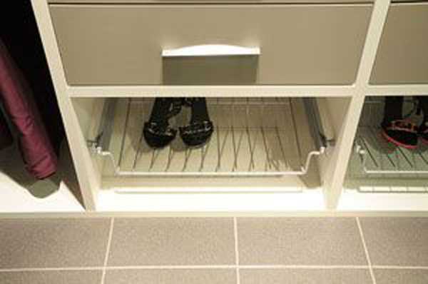 6. Модулями под обувь. Хранить кроссовки и туфли можно в коробках, выдвижных ящиках или галошницах, имеющих вид специальных подставок. Для сапог нужно обустроить отдельные, более высокие секции, где обувь с мягким голенищем можно будет аккуратно подвесить для сохранения формы. Неиспользуемые в конкретное время пары отправляются на антресоли. Повседневная обувь хранится пониже.