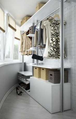 Балкон. Не забывайте и про эти полезные метры. Если балкон застеклить и утеплить, он вполне может стать гардеробной. С помощью современных приспособлений, выдвижных элементов, ее можно сделать очень удобной и использовать даже труднодоступные места.