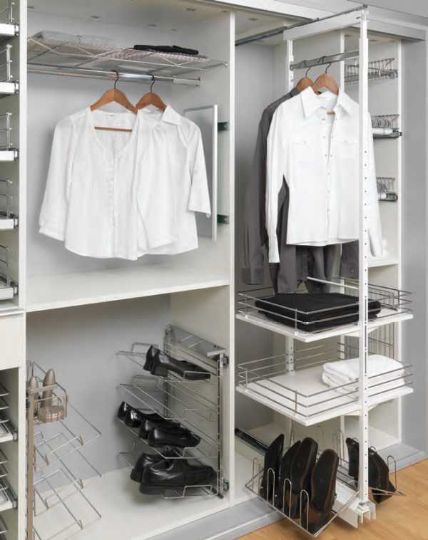 ОСНАЩЕНИЕ. Современные приспособления для гардеробных добавят ей функциональности и удобства. Это и выкатные/выдвижные корзины и ящики, приспособления для аксессуаров, брючницы, галстучницы, пантографы и пр.