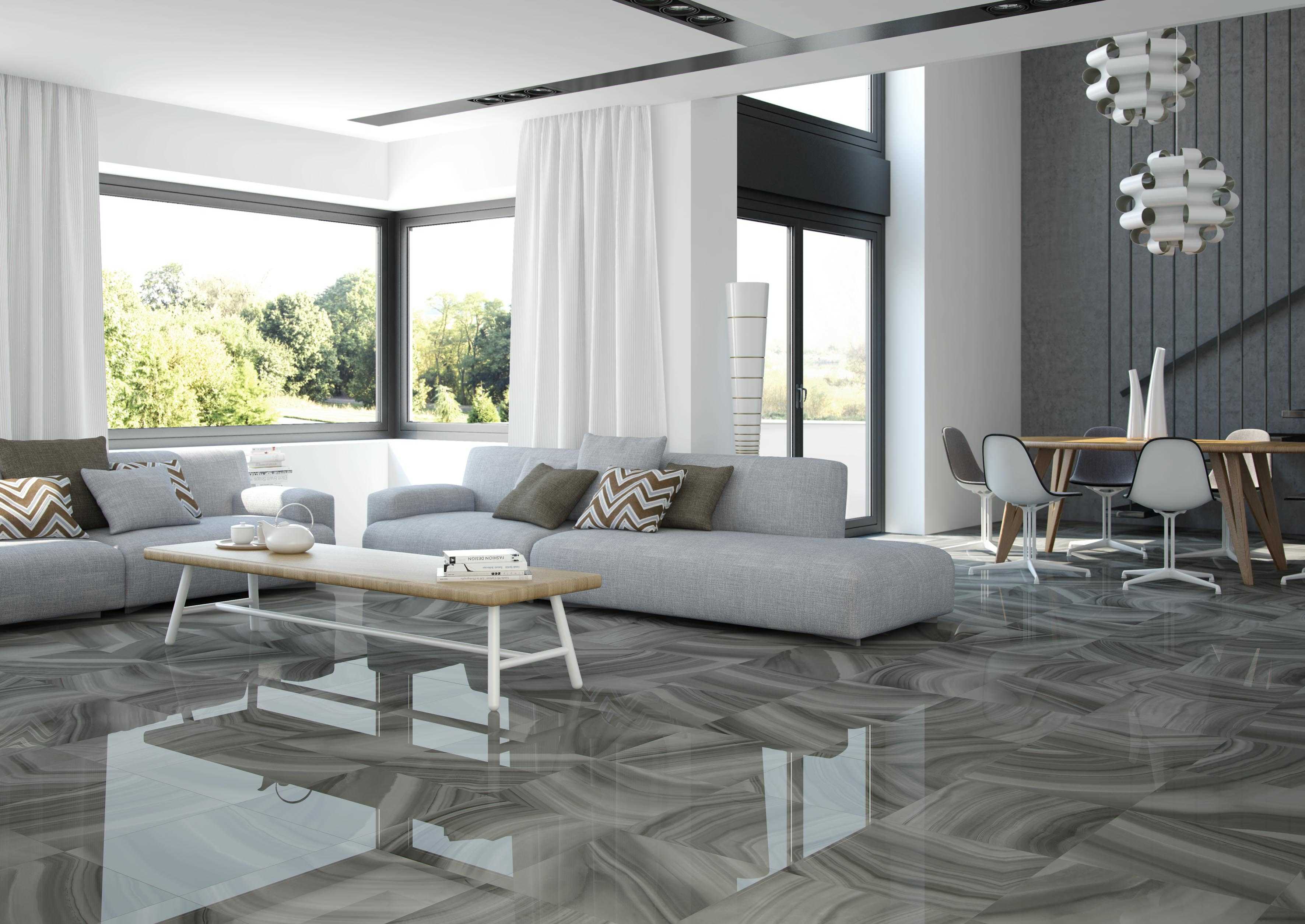 Глянцевый пол в интерьере гостинойОсобенности применения глянцевой плитки на пол