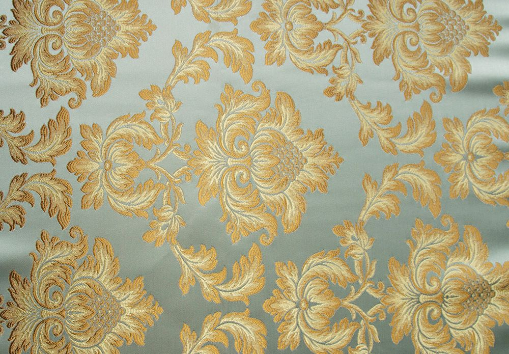 Красивые золотистые узоры на голубых обоях придадут царственности интерьеру, оттенят розовый мрамор отделки пола в парадной комнате.