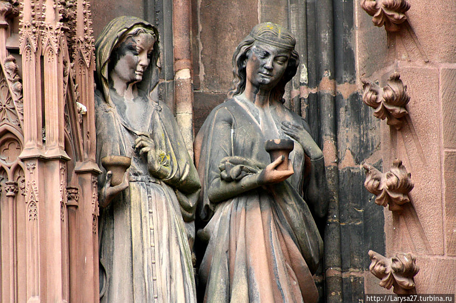 Две женские скульптуры Страсбургского собора (30-е гг. 13 в.) привлекают духовной чистотой, грацией, изяществом стройных пропорций. Одна из них символизирует торжествующую Церковь, другая — побежденную Синагогу. Церковь, с открытым властным взглядом, с гордой осанкой, оттененной спокойным плавным ритмом складок одежд, дана как положительный образ. Роняющая разорванные скрижали Завета, Синагога с завязанными глазами — трагична. Печально поникшая голова, сложное спиралевидное движение гибкого тела, неожиданно резкий надлом копья выражают ее душевное смятение, неустойчивость. Обращают внимание меткие наблюдения художника, стремление воспроизвести конкретные детали. Сквозь повязку на лице Синагоги просвечивают очертания глаз, через тонкую ткань, покрывающую руку Церкви, проступают ее изящные формы.