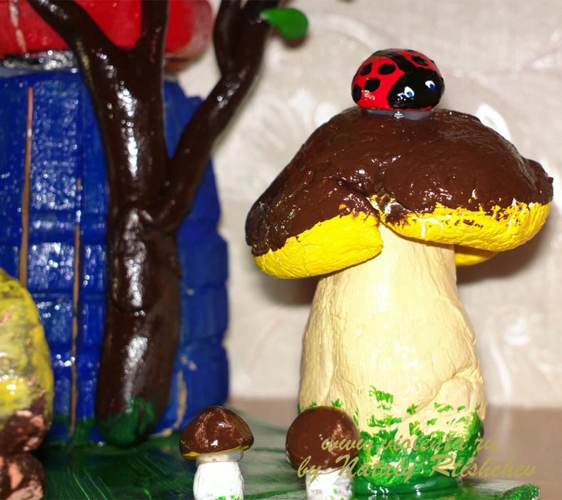 Очень хорошей и креативной поделкой в виде гриба своими руками станет домик-гриб из пластилина, который будет отличным дополнением к вашему интерьеру и будет радовать глаз.