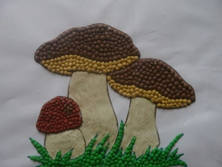 Можно работать в технике ПЛАСТА – ком пластилина плющим в лепешку раскатываем скалкой (гладкой бутылочкой от лака для волос и др) и из пласта вырезаем нужный для аппликации силуэт — именно так вырезаны силуэты грибов на фото поделки ниже.