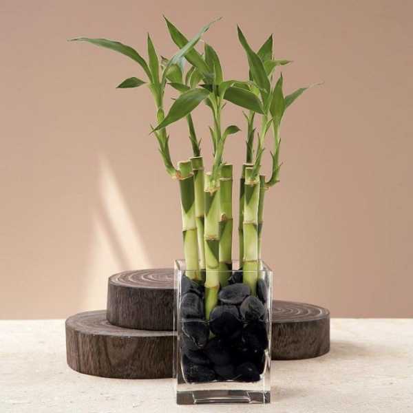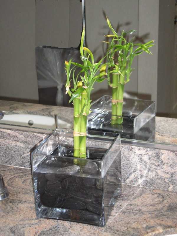 Если декоративный бамбук находится в стеклянной вазе, можно насыпать на дно ракушки или камешки, предварительно обдав их кипятком для уничтожения возможных вредных микроорганизмов. Для исключения размножения бактерий в воду неплохо добавлять уголь.
