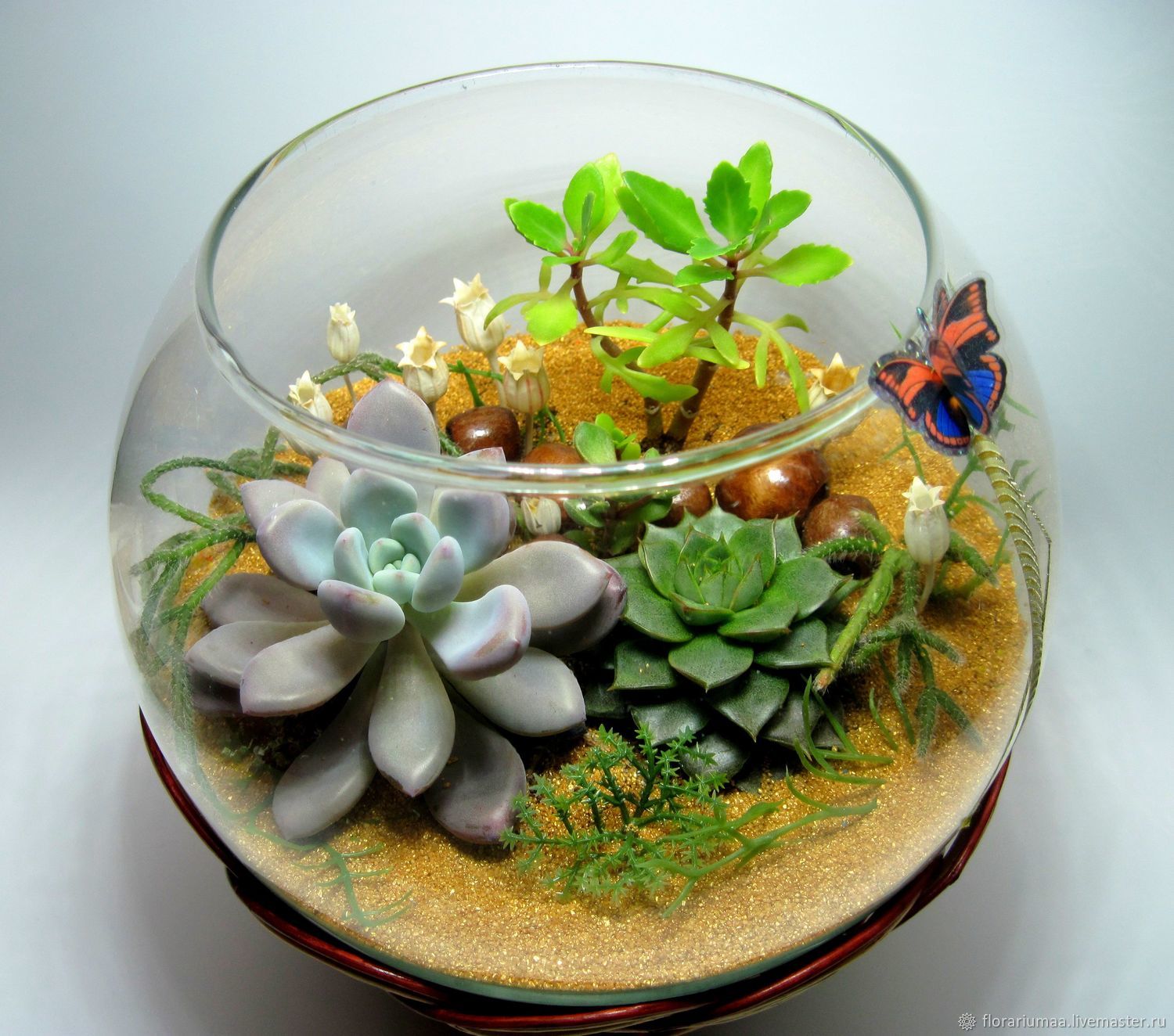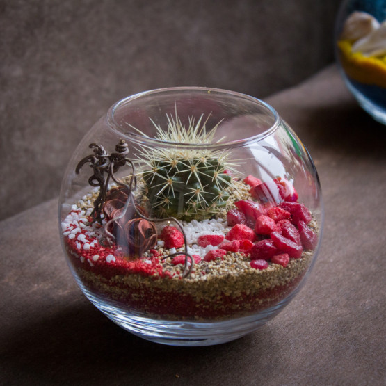 Выбор украшений для флорариумов велик и ограничивается лишь вашей фантазией. Я использую цветной кварцевый песок. Удобно, что он не красится, если на него попадает вода при поливе.