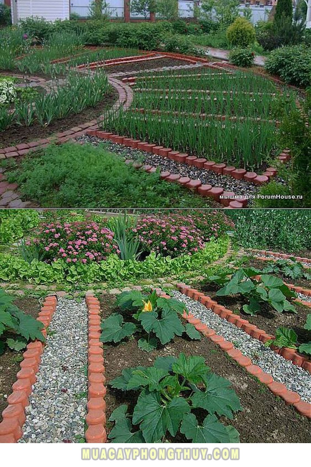 Идеальное решение, когда огородик находится возле кирпичного дома. Материал размещается разными способами. Если не имеете представления, как сделать оформление, то создайте композицию, вкапывая кирпичи или выкладывая его под углом.