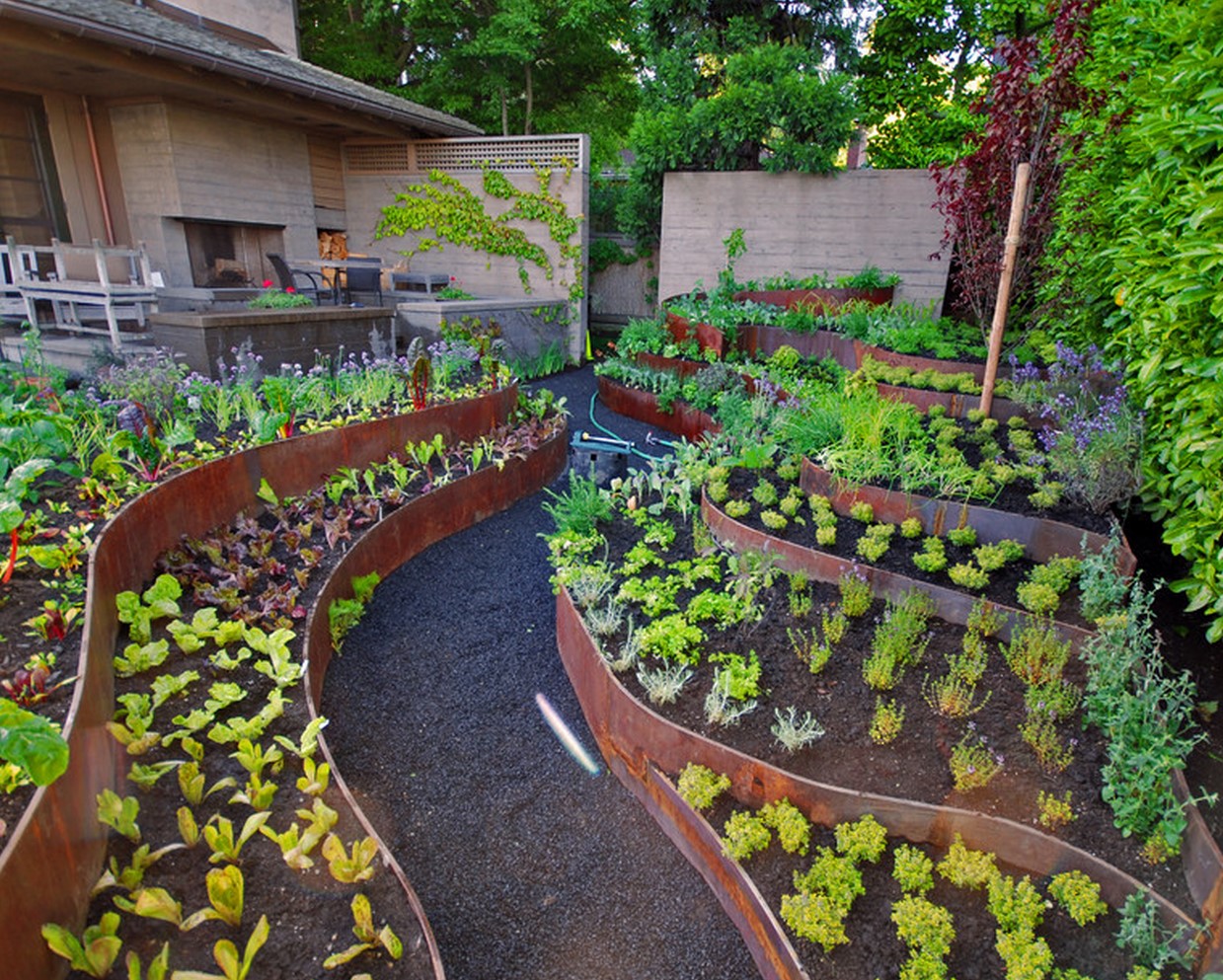 В индустриальном стиле с современной эстетикой листовой металл приобретает естественный цвет стали и со временем образует великолепную ржавую патину. Он выпускается в виде листов толщиной около дюйма, что придает ему тонкий профиль, а не громоздкий периметр, и листы имеют простую форму, необходимую. Листовой металл хорош тем, что он нагревает почву, поэтому может быть полезен, когда растениям требуется дополнительное тепло для роста.