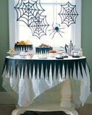 Следующая комната, куда попадут приглашённые на праздник — гостиная. Она должна по стилю быть продолжением того, что уже видели при входе. Имитацию паутины здесь можно создать при помощи клубка белых шерстяных нитей (приклейте к ним паучков из чёрной бумаги). Подчеркнуть ветхость мебели помогут куски рваной марли.