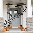 Если хочется чего-то более необычного, можете, например, вырезать из черной бумаги силуэты летучих мышей. Приклейте стайку мышей на стену; для придания объема можно отогнуть крылья, как на фото: