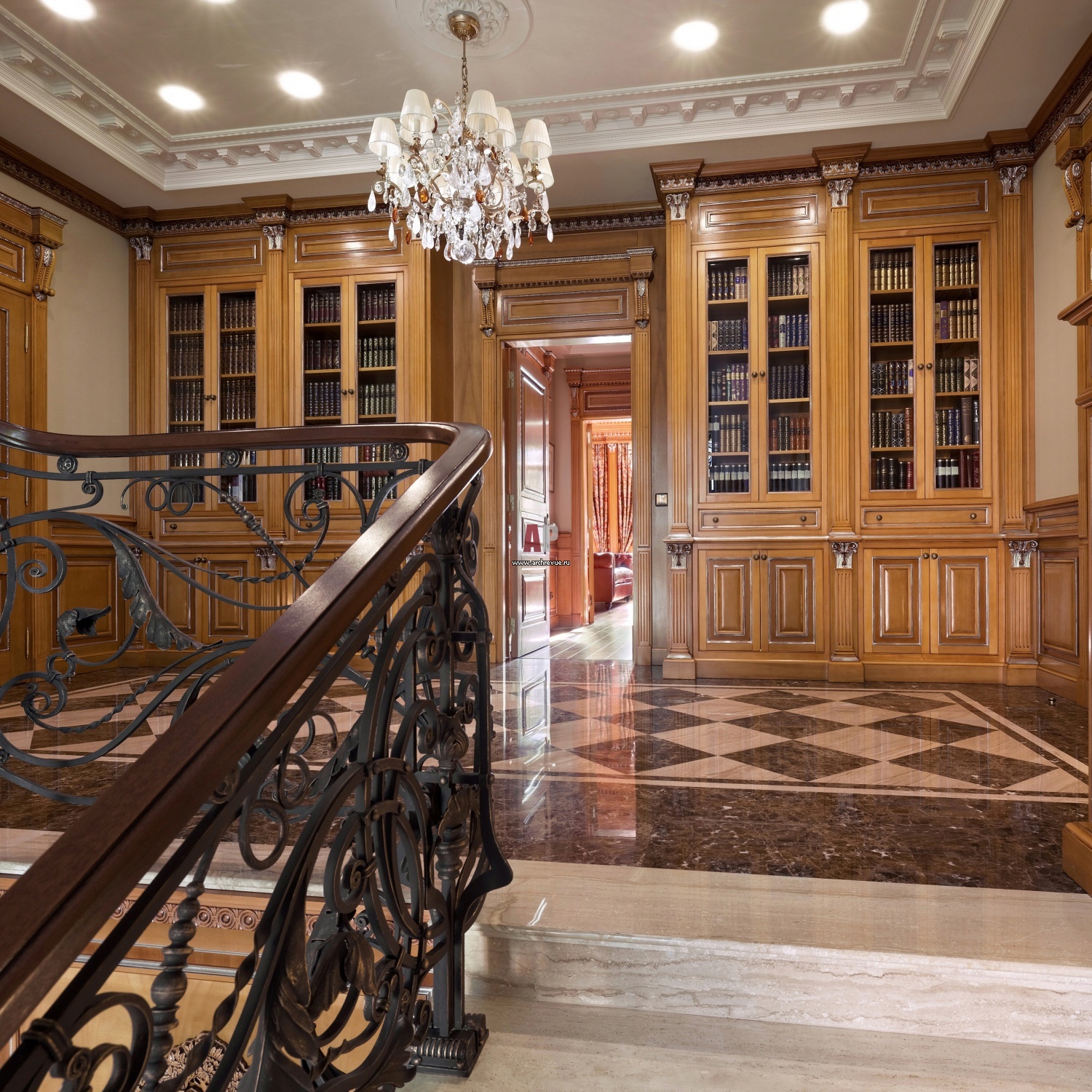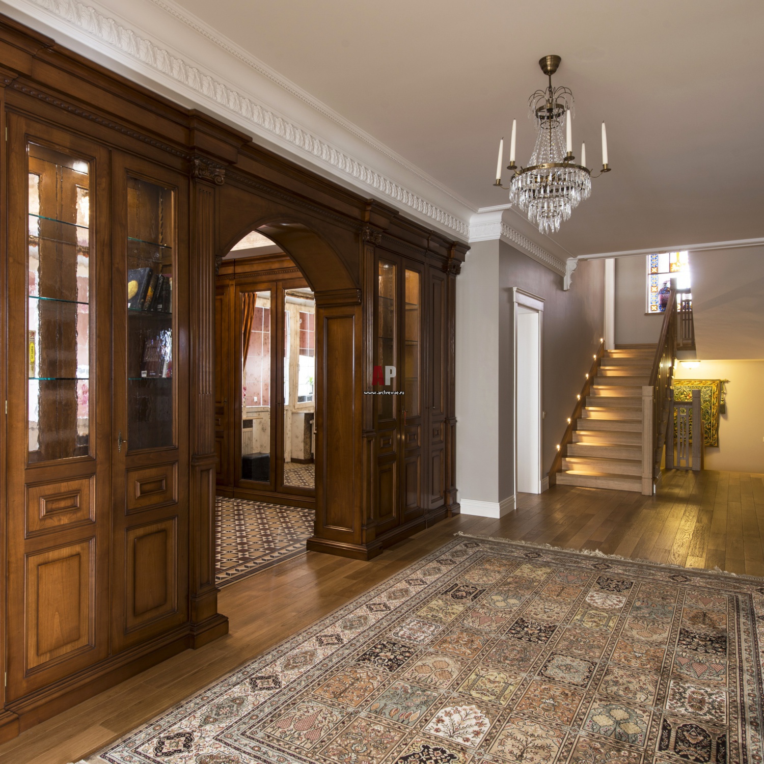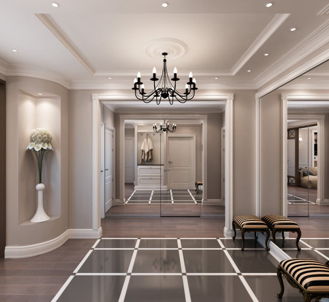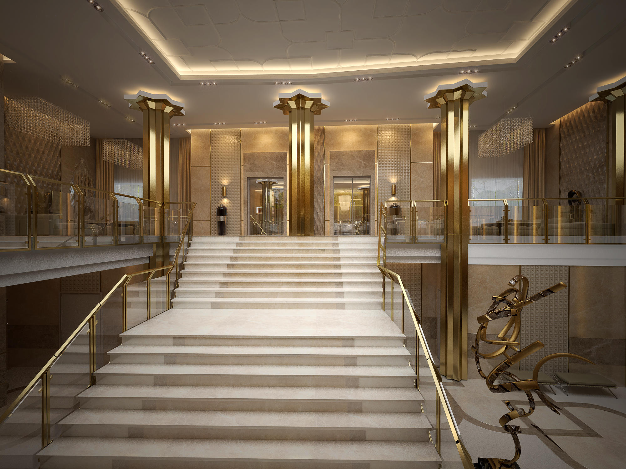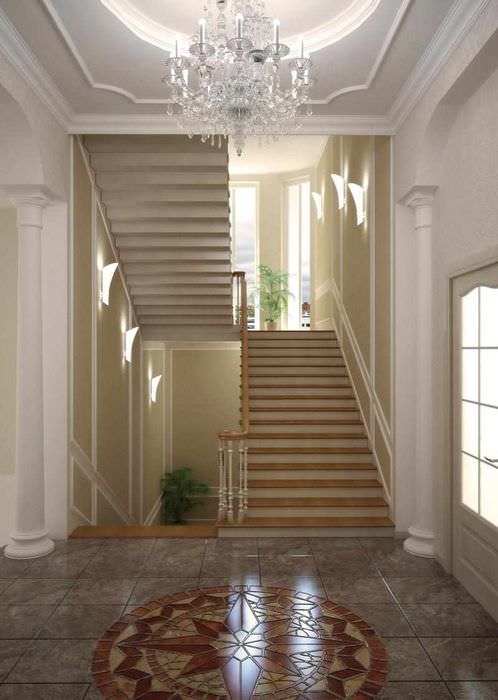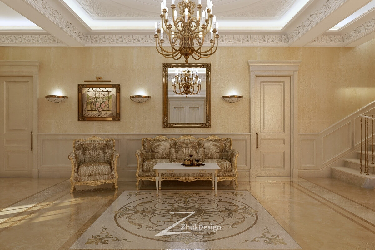 Освещение, лестницы, навигация, почтовые ящики, часы — здесь всё является элементами дизайна интерьера, совместно образующими целостную картину. Зеркала в рамах со скрытой подсветкой — функциональный элемент, позволяющий жильцам и гостям посмотреть на себя в полный рост и в то же время элемент дизайна, который украшает и визуально расширяет интерьер. Сочетание скрытого света, потолочных встроенных светильников и настенных бра позволяют добиться парадной и одновременно уютной атмосферы. Акцентами являются элегантные кресла, которые в сочетании с округлыми формами торшера и бра привносят в интерьер ощущение мягкости.