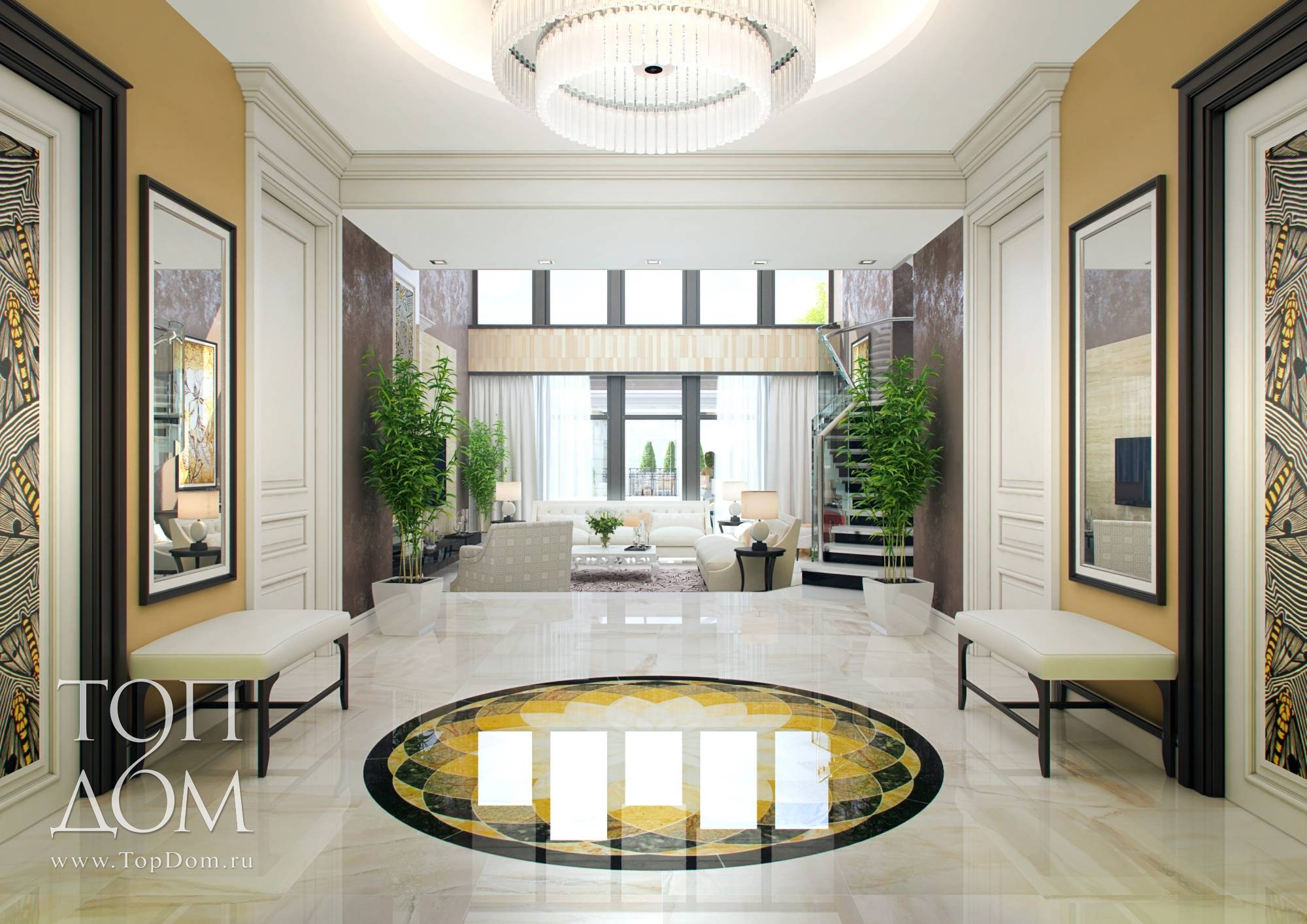 ограждение лестницы, напольные кашпо и рамы зеркал.