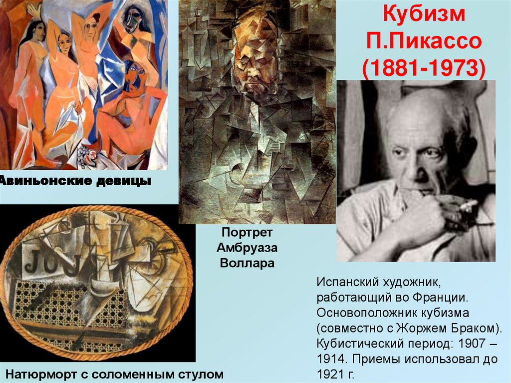 Кубизм возник чуть позднее фовизма, его основоположниками считаются Жорж Брак (Georges Braque) и Пабло Пикассо (Pablo Picasso).