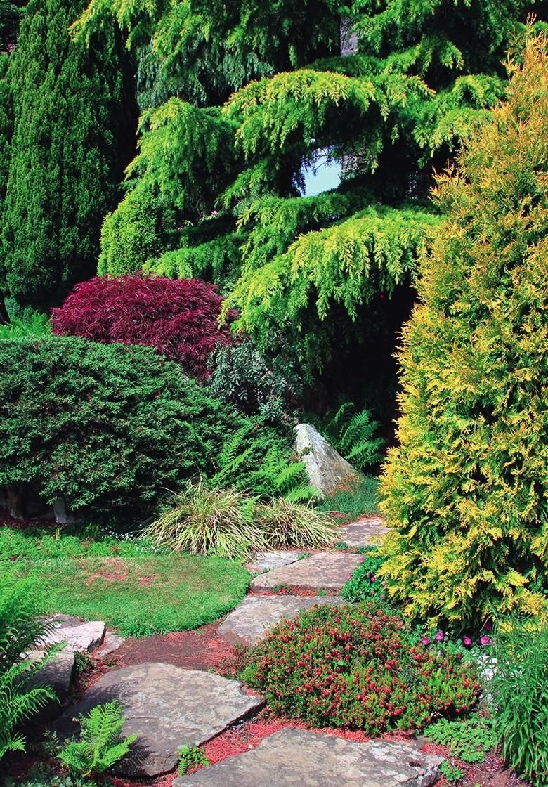 Хотя многие из хвойных деревьев, которые мы решили выбрать, имели ярко-желтую или синюю листву, этот критерий не был исключительным, и мы знали, что несколько других разновидностей хвойных также будут играть роль, например.грамм. Chamaecyparis obtusa Nana с бутылочно-зеленой листвой и Chamaecyparis Lawsoniana Summer Snow с белыми молодыми листьями. Мы также решили выбрать по несколько хвойных пород каждого из родов хвойных деревьев Taxus, Abies и Thuja.