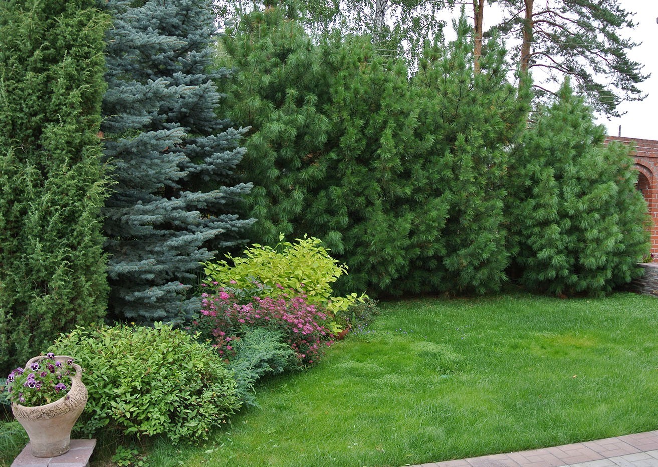 Обычные хвойные, высаженные перед фасадом участка и возле дома соседям не помеха, главное, чтобы корневая взрослых деревьев не подходила к фундаментам построек ближе 2 метров.