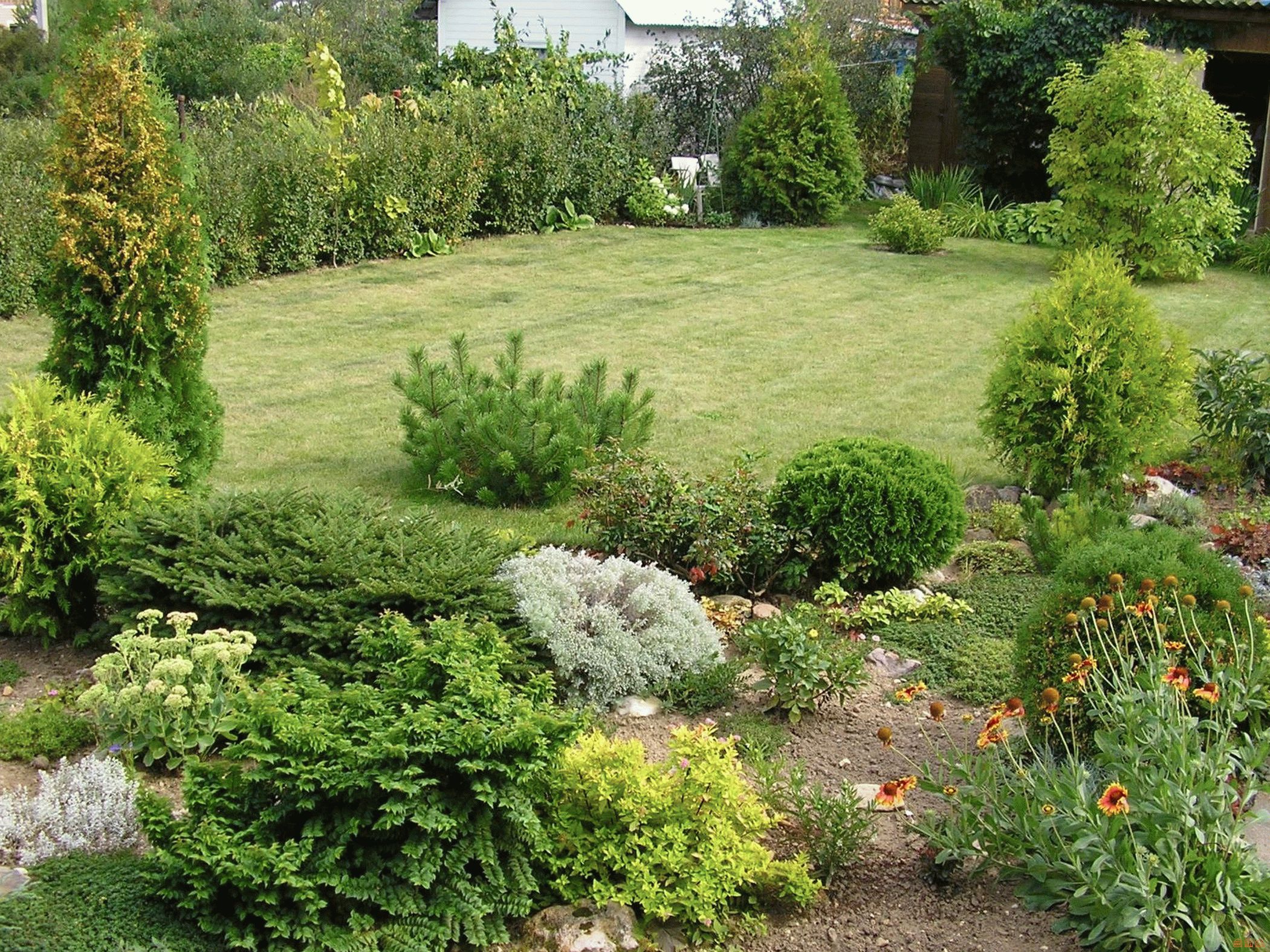 Обратите внимание выше на фото дизайна хвойных растений: из них можно сформировать живописную живую изгородь, которая будет играть роль садовой перегородки — разделять садовые зоны.