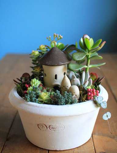 Название во многом говорит само за себя. Основная идея – создание высокогорного пейзажа. Стоит обратить свой взор на плющ, кактусы, селегинеллу. Они не требуют особого ухода. Достаточно поддерживать нужную для этих растений температуру и поливать их по мере высыхания грунта. Для почвы подойдет органика или крупная галька. Камни разной формы смогут стать отличной имитацией скал. Для эстетического эффекта стоит присмотреться к слегка зауженным емкостям.