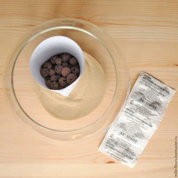 2. Затем надо насыпать дренаж, высота которого не должна превышать 4–5 см. Выступать им может керамзит, мелкий песок, галька для аквариума или камни. Поверх него можно уложить несколько таблеток активированного угля (заранее растереть в порошок). Это поможет обезопасить почву от химикатов, которые могут поступать вместе с водой.