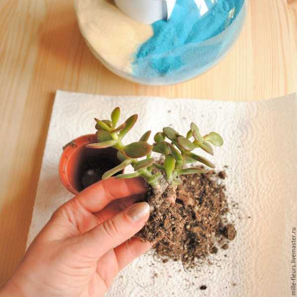 11. Вынимаем суккулент из горшочка и тщательно избавляем корни от лишнего грунта: