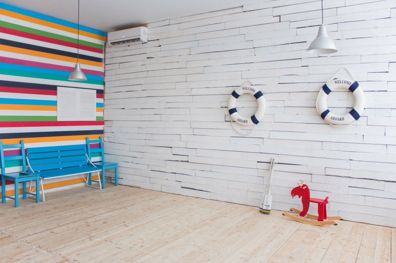 Продолжением металлической истории является аутентичная подвесная люстра. Черные прутья образуют многослойные ромбы с центральной композицией из свечей-лампочек. Для детей выделена особая зона, где расположен вигвам, деревянная лошадка. Каждая деталь здесь также поддерживает заданную природно-эклектичную атмосферу. Соединяет воедино все детали локации светлые рельефные стены, серый текстурный пол.