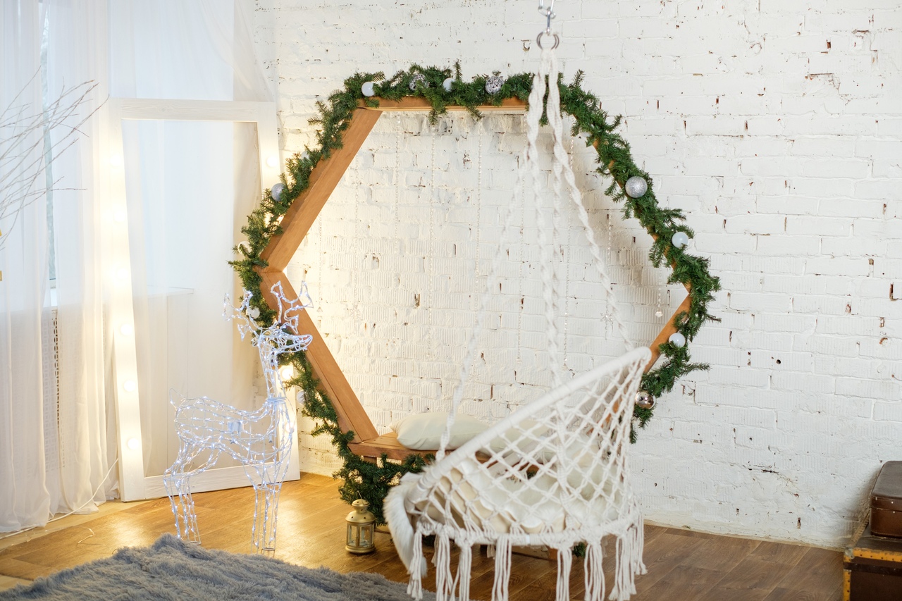 Все, фотозона готова. Сюда же отлично подходят маленькие скамеечки, бинбэги (такие пуфы-кресла), небольшие журнальные столики. Ну, и елка! Если у вас получится включить елку в кадр — просто прекрасно. И она является отличным задним фоном!