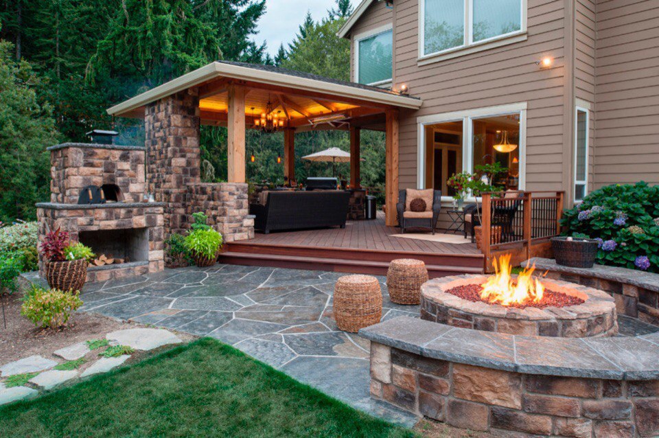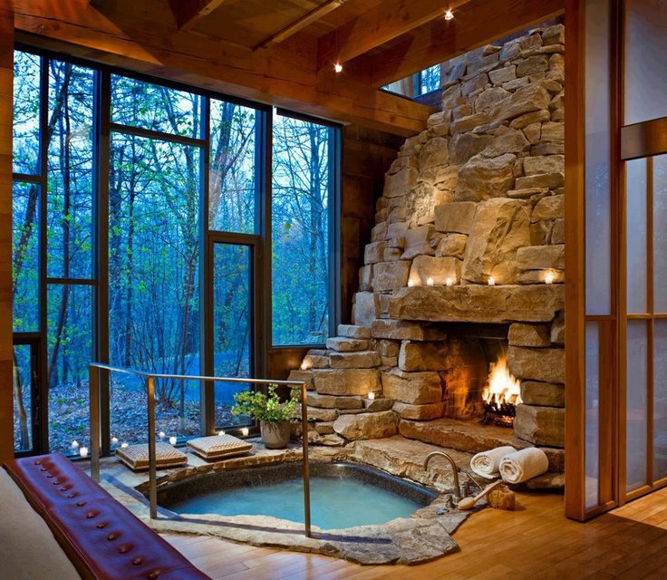Интересная идея открытой площадки для отдыха с камином двойного применения внутри и снаружи:
