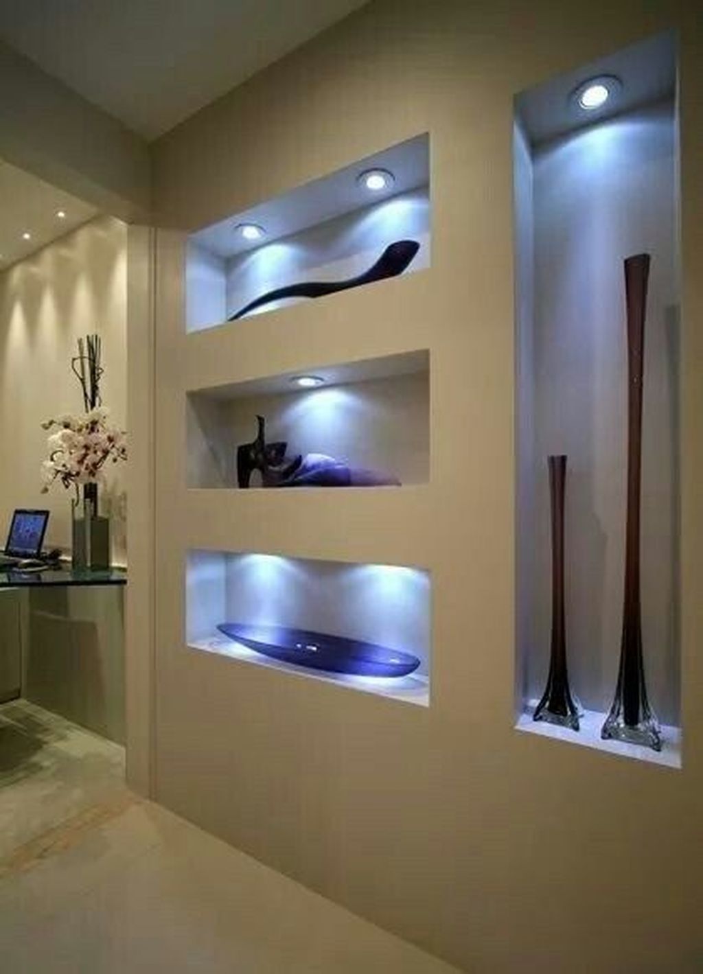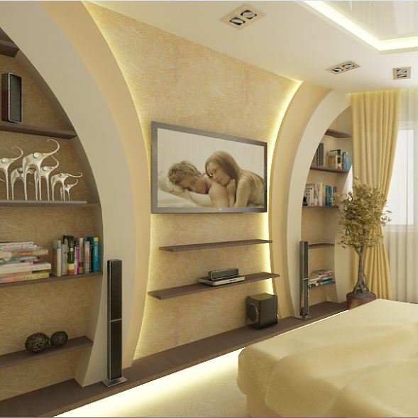 Создать уют в зоне спальной комнаты можно при помощи ниш, в которых можно разместить спальные принадлежности. Создание ниш уместно и в зале, ведь там поместятся телевизор, различные статуэтки и прочие милые вещи.