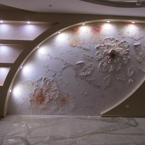 Рельеф можно создать и на гладком гипсокартоне. Гипсовую или декоративную штукатурку покупают в строительных магазинах, объемные 3D-изображения изготавливают на заказ, а декоративный кирпич вырезают из остатков гипсокартона своими руками.