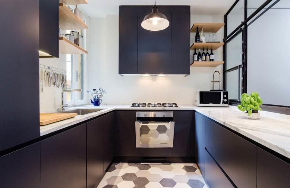 Наиболее неудобная форма кухонного гарнитура, хотя и выглядит эффектно. Дело в том, что из-за разрыва рабочей поверхности процессы приготовления еды придётся делить.