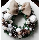 - Теперь положите искусственно белые ягоды на сосновые листья и прикрепите их клеем или проволокой. Постарайтесь равномерно распределить ягоды по каждой части венка.