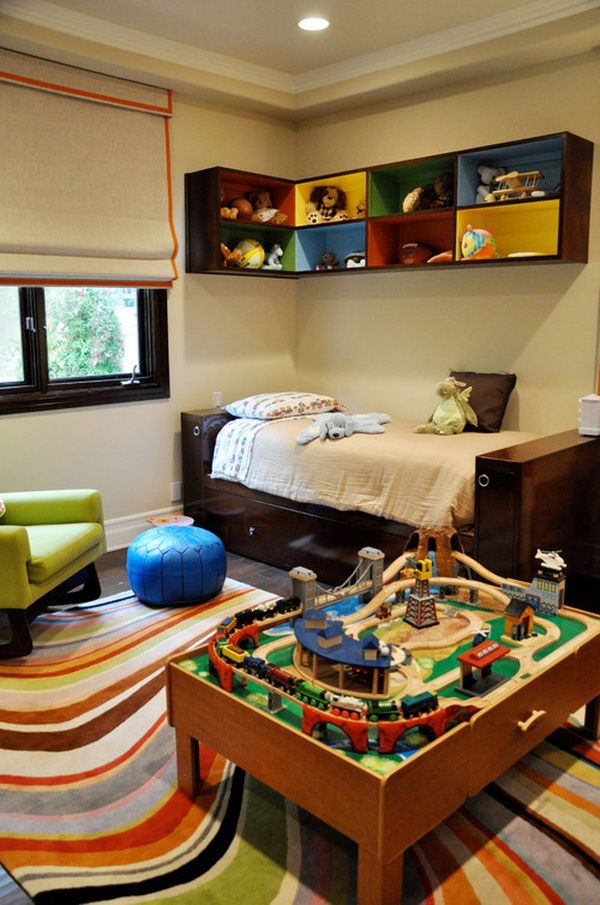 Небольшой стеллаж или полки с корзинками помогут малышу поддерживать в комнате порядок, аккуратно складывая игрушки.