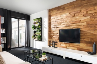 Такие полотна отлично впишутся и в лофт-дизайн. Имитация затейливого орнамента, выложенного из деревянных элементов уместна в современном интерьере. Не помешают в таком дизайне и комнатные растения, которые прекрасно соседствуют с такой отделкой.