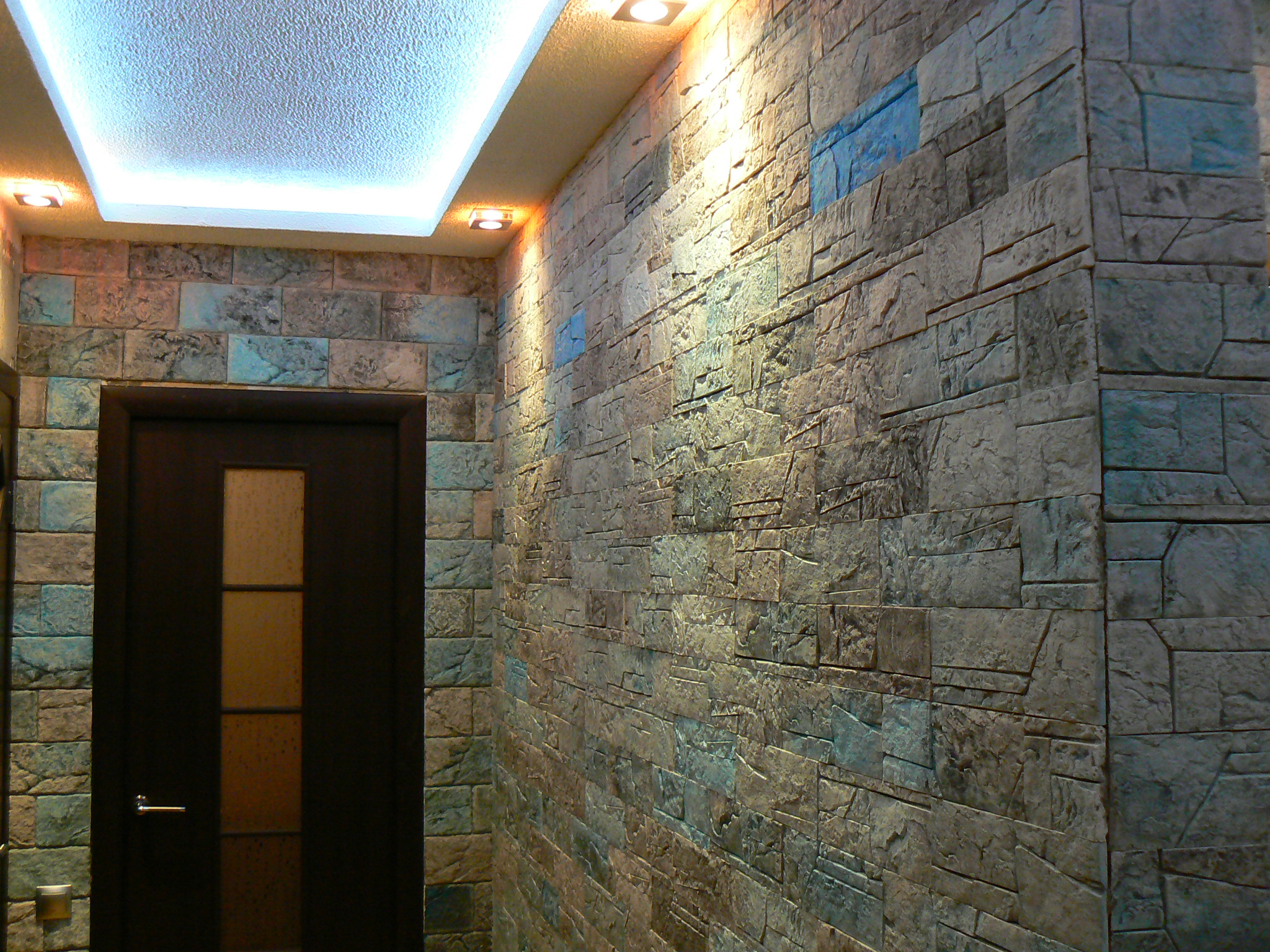 При правильном подборе фактуры и цветов внутренняя отделка под камень может красиво смотреться во всем помещении коридора.