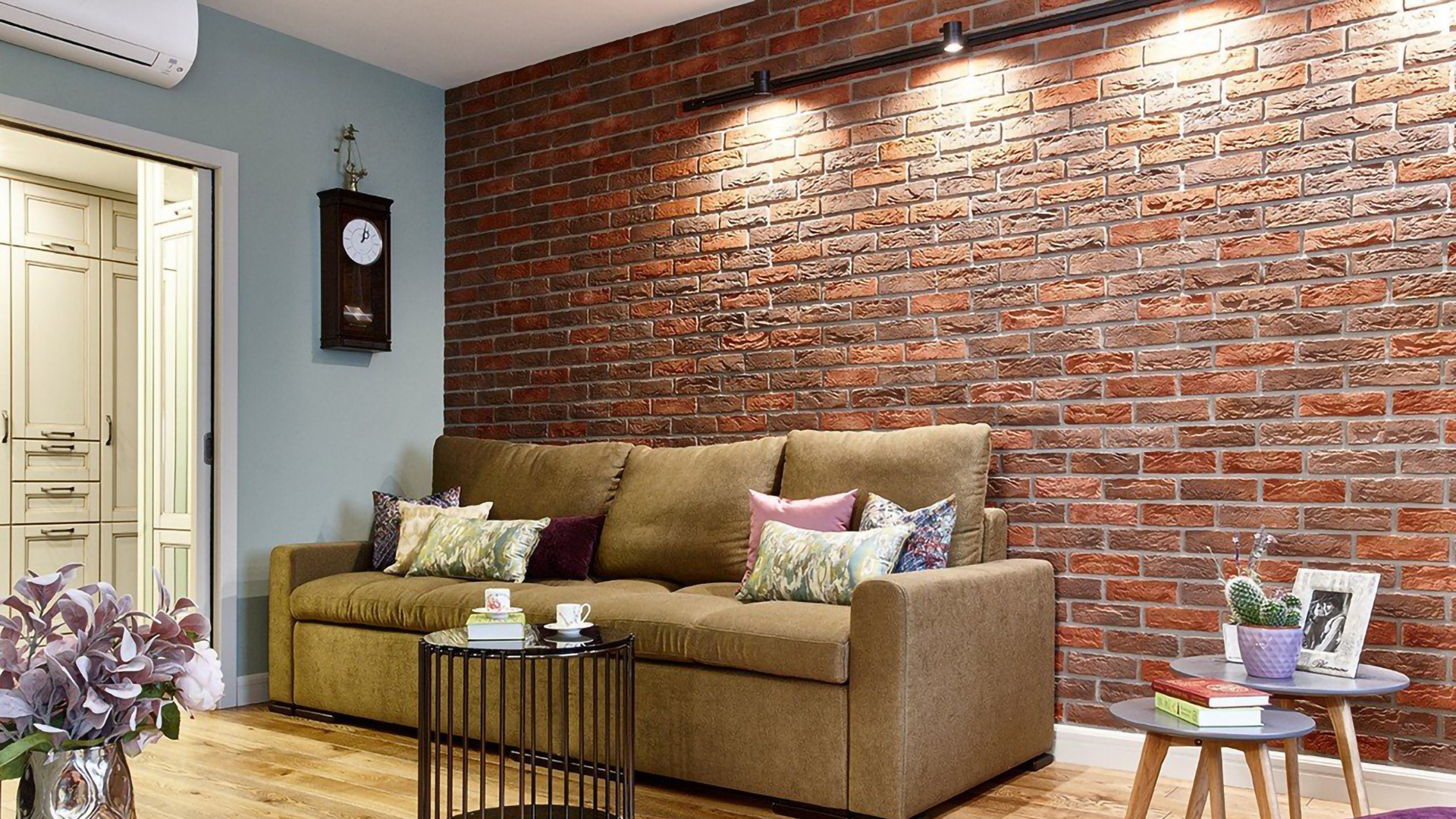 зона отдыха подчеркнута кирпичной стеной за диваном