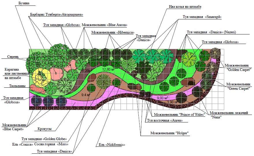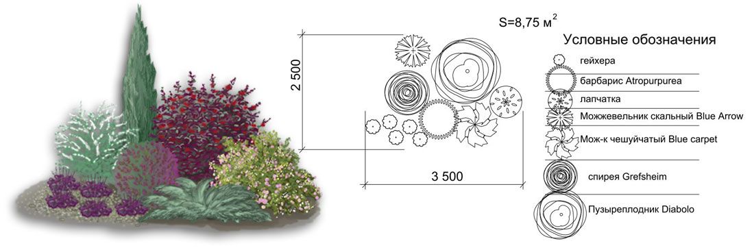 Подбирая растения для композиции, определяют их количество, учитывая площадь размещения и расстояния при посадке.