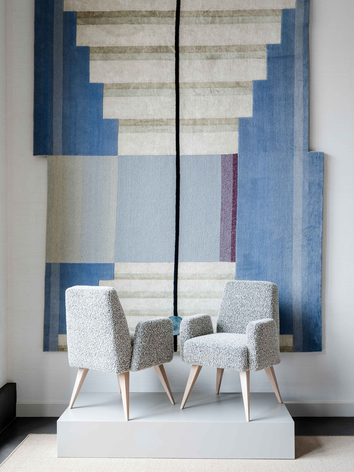 Над ним работа Гульнур Мукажановой: в качестве материала художник использует войлок. Слева кресло Пола Эванса. Скульптуры из известняка, автор — Virginie Lebrun, 1970, Karry Gallery, Париж.