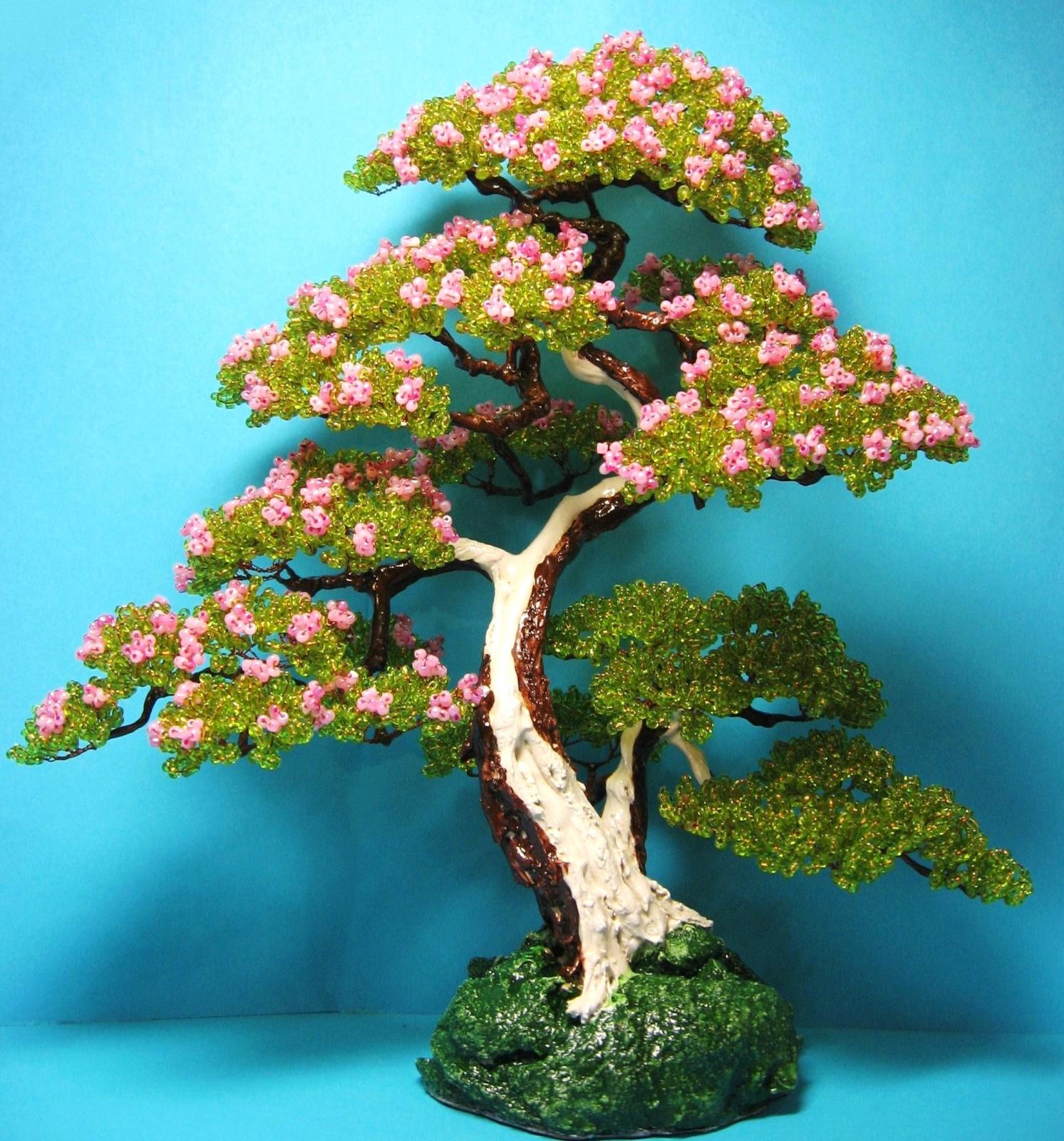 Вот как сделать искусственный бонсай из бисера. Варьируя количество бисеринок в листочке или варианты скручивания веток, можно делать интересные композиции, которые будут непохожи друг на друга. Можно добавлять крупные бусины, которые будут имитировать плоды, монетки с просверленными в них отверстиями или бутоны из бисера. Можно взять за основу поделочные камешки или деревянные бусины. В каждом случае будет получаться оригинальное дерево.