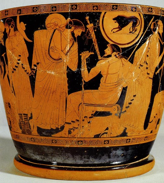 Иллюстрация: копия эпохи Августа оригинала второй половины V в. до н. э., приписываемого Алкамену, ученику Фидия. Имена персонажей были добавлены копиистом. Подобный рельеф находится в Лувре.