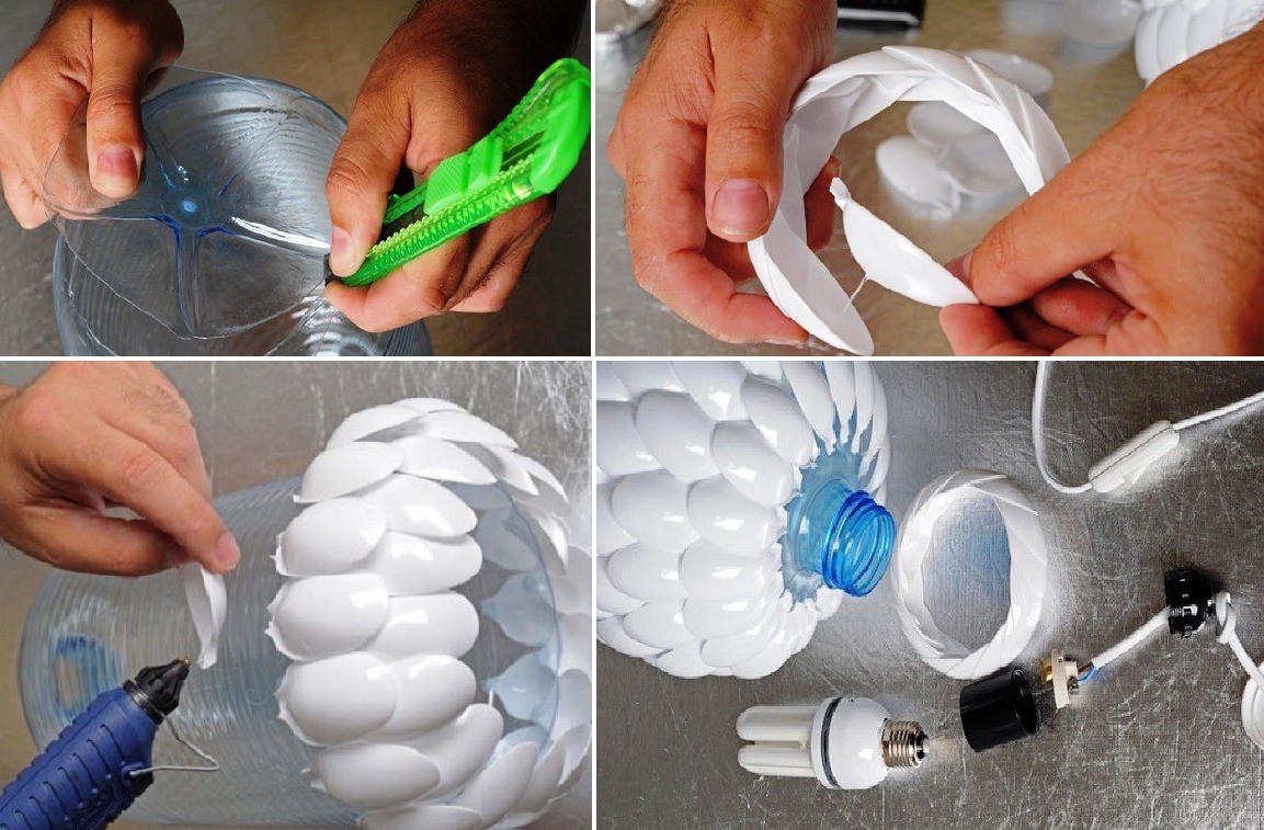 Довольно оригинальные светильники получаются из дешевого бытового пластика: бутылок, одноразовых стаканчиков, ложек и вилок. Сделать люстру из этих подручных материалов можно по такому же принципу — на каркас из 5-ти литровой пластиковой бутылки крепятся декоративные элементы из одноразовой посуды.
