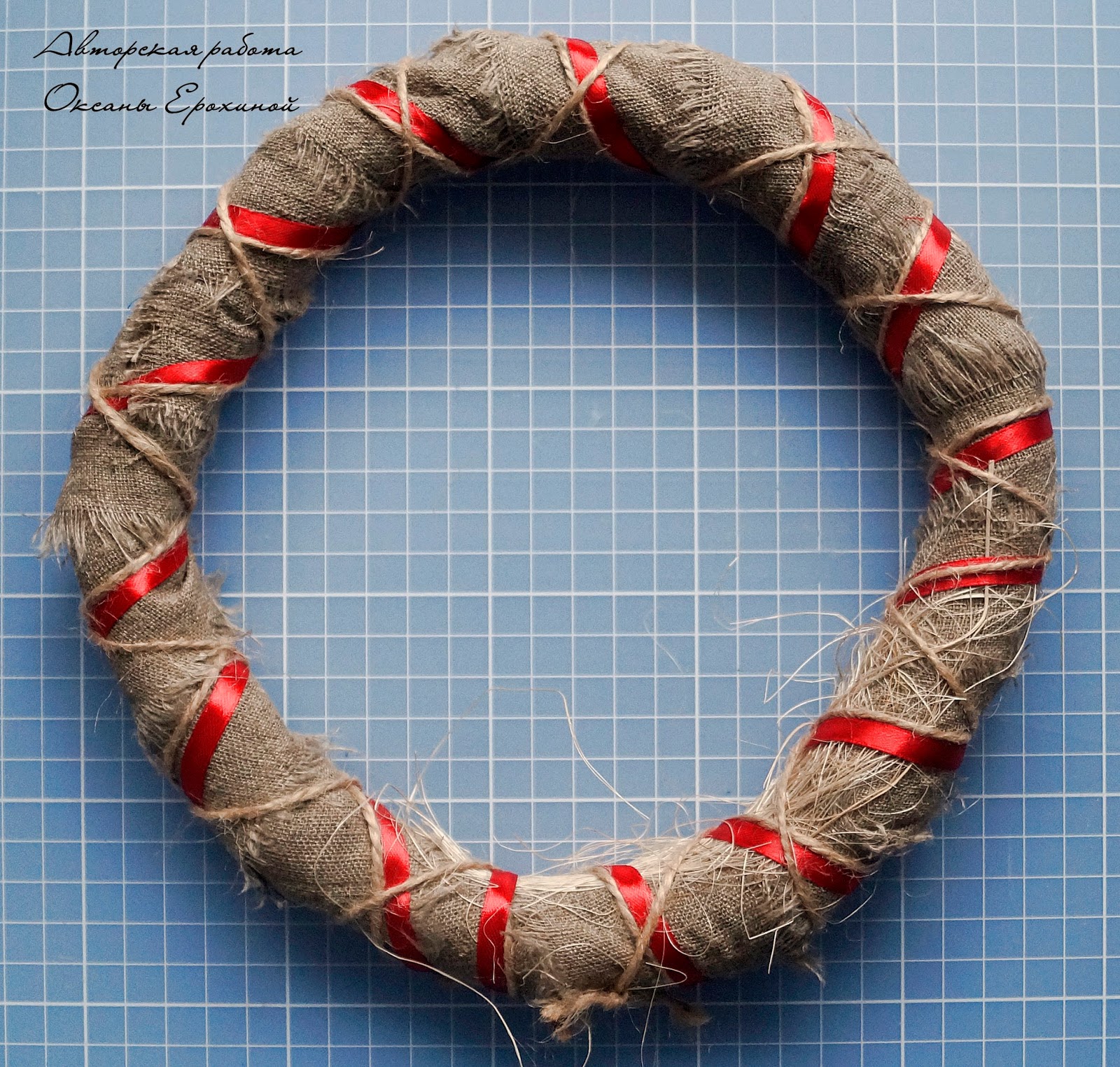 После того, как основа для новогоднего венка готова, декорируйте ее широкой атласной лентой или яркой тканью. Закрепляйте периодически каплей клея. Хорошо смотрится цветная мешковина или ткань с мелким новогодним рисунком.