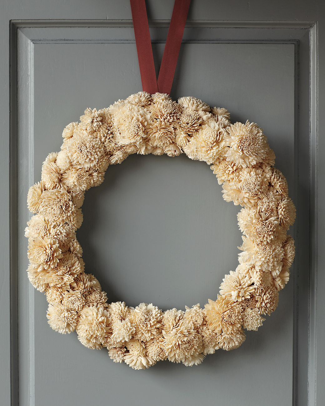 - Из кисточек для побелки стен известкой. Из нескольких разобранный кистей получается отличный венок. Скрепить волокна между собой можно тонкой проволокой либо нитью.