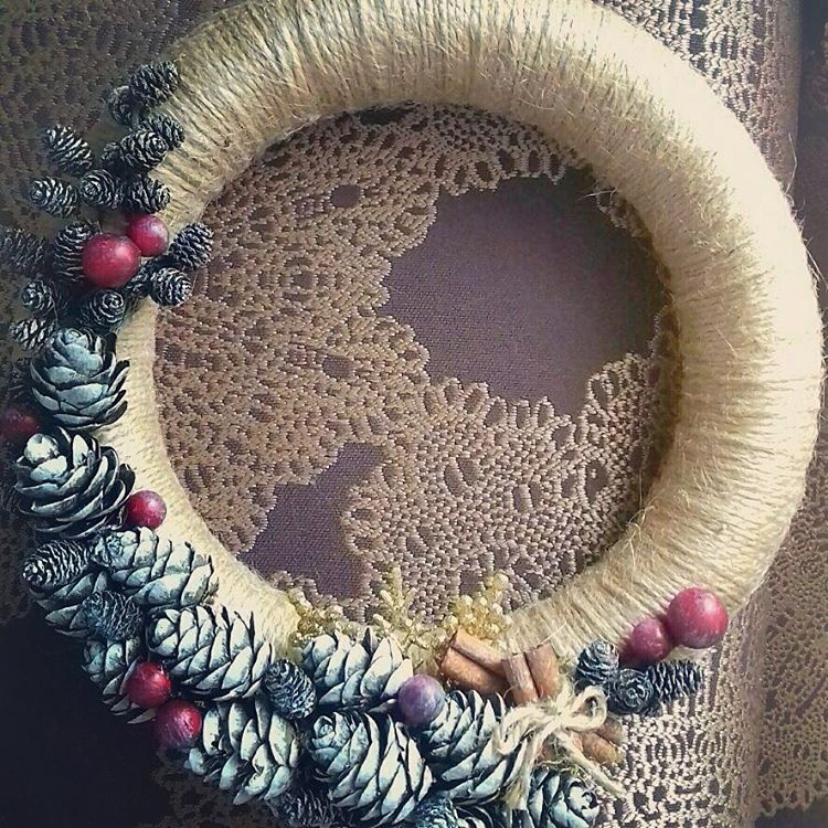 Этот же плоский картонный бублик для рождественского венка можно покрасить краской. И сразу начать облепливать заготовленным материалом – еловыми лапками, пихтовыми веточками, бумажной мишурой, елочной гирляндой или лесными шишками (как на фото ниже). Шишки крепим на монтажную пену или горячий клей из клеевого пистолета.
