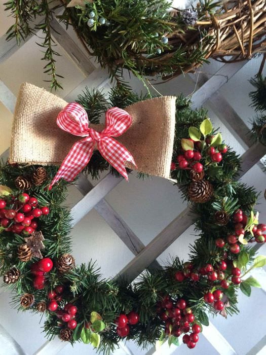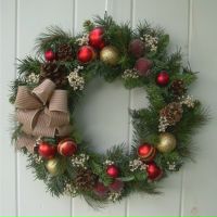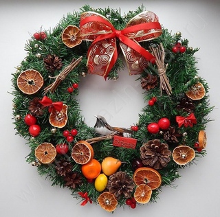- Непосредственно то, из чего венок. Можно ведь сделать бумажный венок, венок из орехов, ей елочных ветвей, шишек. Такие венки обычно делаются просто из проволоки, вокруг которой приклеиваются эти материалы.
